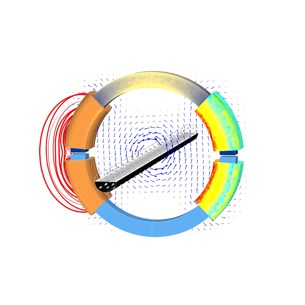 The ABB team turned to the software yet again in order to optimize the split-core current sensor design before prototyping. Paudel has been using it for a long time and enjoys its “ease of use, and the fact that it has the same interface for multiple physics and is easy to couple with other physics.” The COMSOL software includes built-in settings for implementing Maxwell–Ampère’s law and an interface to solve for the magnetic fields in the frequency domain (Figure 5). By using geometric symmetry, the ABB team only has to model one-fourth of the coil, saving time, effort, and computational resources. A special coil modeling feature enables the team to set up the primary coil as a solid conductor and the secondary coil as a homogenized multiturn coil. A boundary condition describes the area where the tangential component of the magnetic field and surface current density is zero as a perfect magnetic conductor, and the external boundaries are set to be magnetic insulators. Solver features enable the team to easily adjust the settings between solid and homogenized conductors, and solid conductors versus wires.